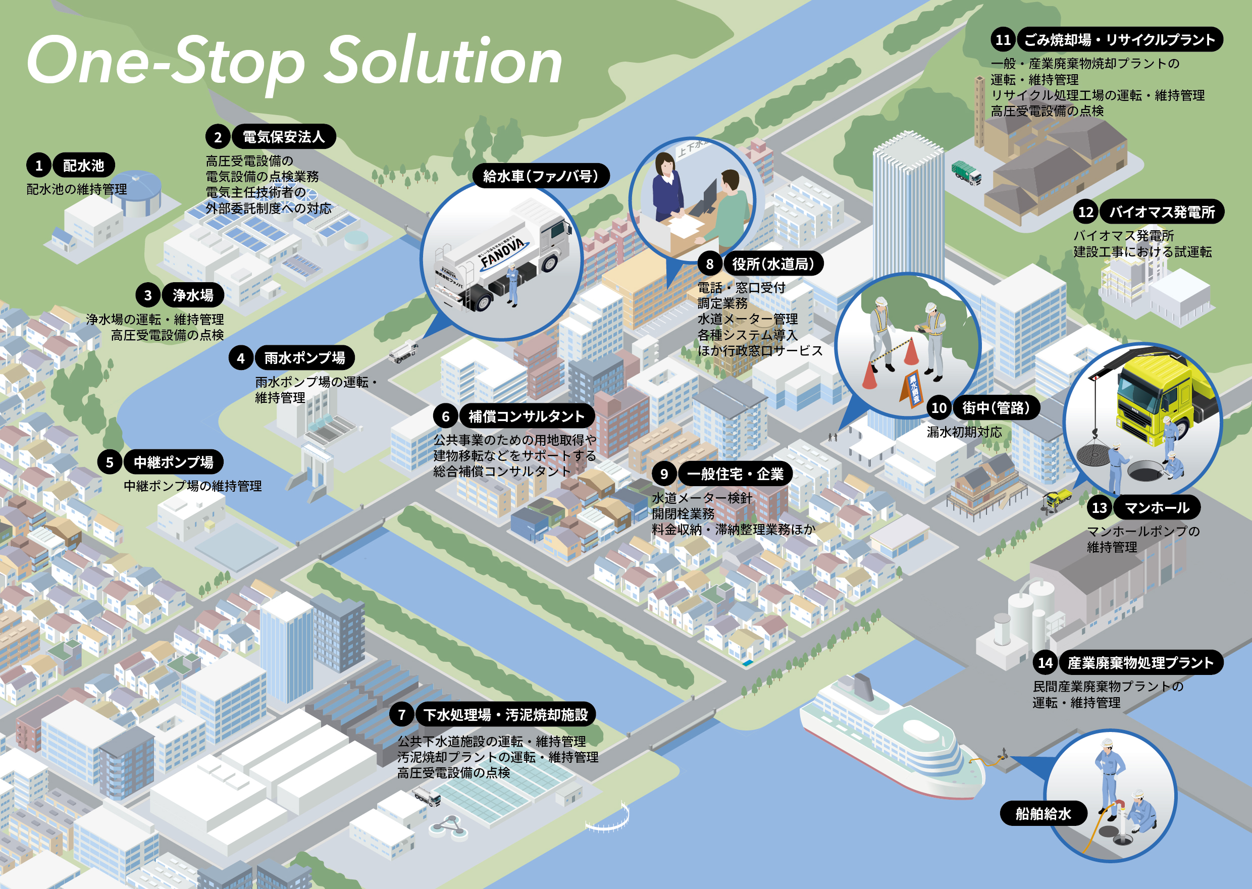 電話・窓口受付、調定業務、水道メーター管理、各種システム導入、ほか行政窓口サービス